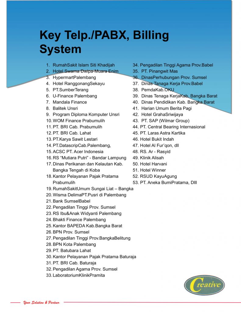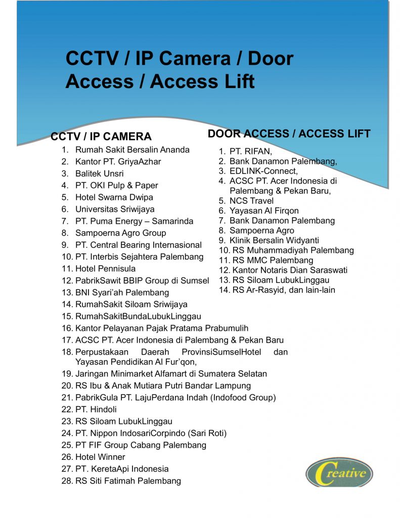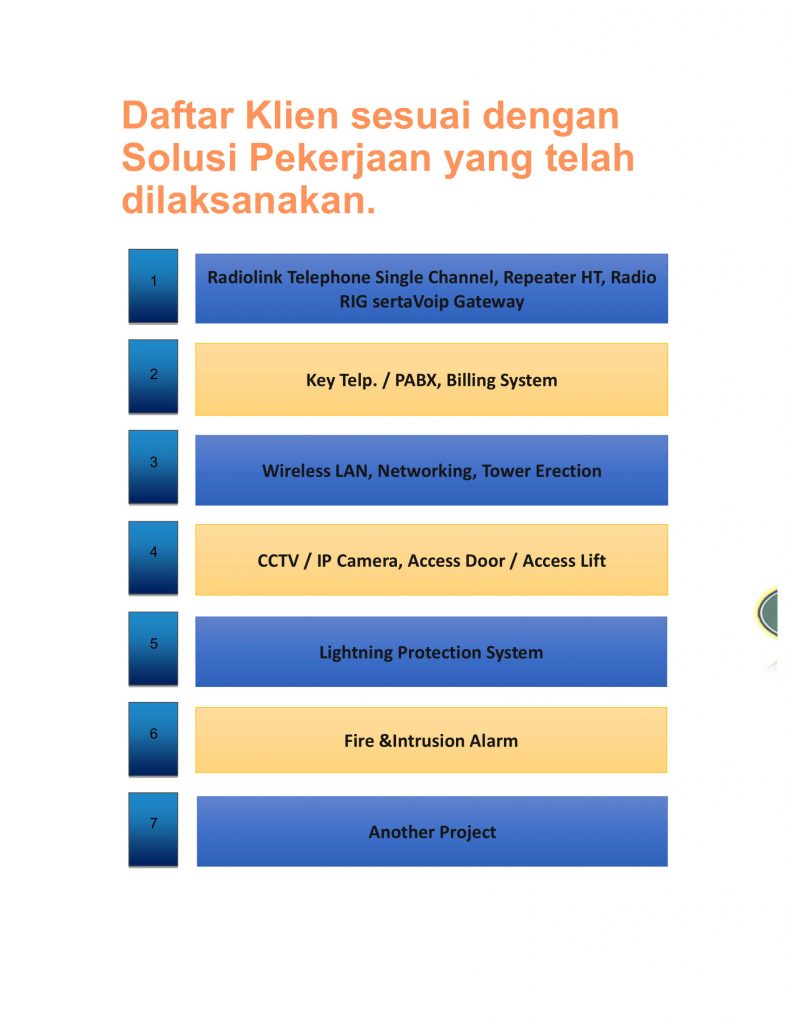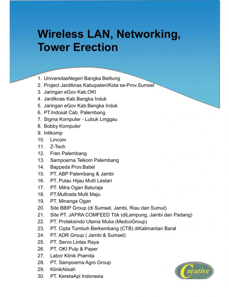 Sejak 1997, banyak pekerjaan yang telah dilakukan, baik terhadap konsumen perorangan, badan usaha, instansi pemerintah maupun BUMN. Ruang layanan pun tidak terbatas di kota Palembang, melainkan juga sampai seluruh kabupaten/kota di provinsi Sumatera Selatan hingga keprovinsi lain seperti Bangka Belitung, Jambi, Riau, Sumatera Barat, Sumatera Utara, Lampung, Bengkulu, Kalimantan Barat, Kalimantan Timur, Bekasi dan Jakarta.